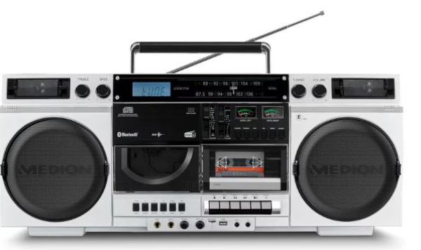 Tauchen Sie ein in die Zeit der Neonfarben und der pulsierenden Musik und geniessen Sie dabei modernste Technologie. Erleben Sie kabellose Freiheit und verbinden Sie Ihr Smartphone oder Tablet ganz einfach per Bluetooth mit der Boombox. Ob auf der Schulter getragen oder im Raum stehend – mit der 80's Retro Boombox können Sie Ihre Party im Retro-Stil rocken. Spielen Sie Ihre alten CDs ab oder geniessen Sie MP3-Dateien. Aber das ist noch nicht alles, denn das integrierte Kassettendeck bringt 100% 80er Nostalgie zurück! Damit Sie immer auf dem Laufenden sind, haben wir ein DAB+/PLL UKW-Radio integriert. So empfangen Sie Ihre Lieblingssender in glasklarer Qualität und rocken durch die Jahrzehnte. Alle wichtigen Informationen werden übersichtlich auf dem LCD-Display angezeigt. Die Bedienung ist einfach und intuitiv, so dass Sie sich voll und ganz auf die Musik und die kultige Optik der 80's Retro Boombox konzentrieren können. Holen Sie sich die kompakte Musikanlage im Stil der 80er Jahre und erleben Sie die perfekte Kombination aus Retro-Charme und modernster Technik. Geniessen Sie die Freiheit der kabellosen Musikübertragung, die Wiederbelebung Ihrer alten CDs und Mixtapes und all die modernen Features, die diese Boombox zu einem absoluten Must-Have machen.