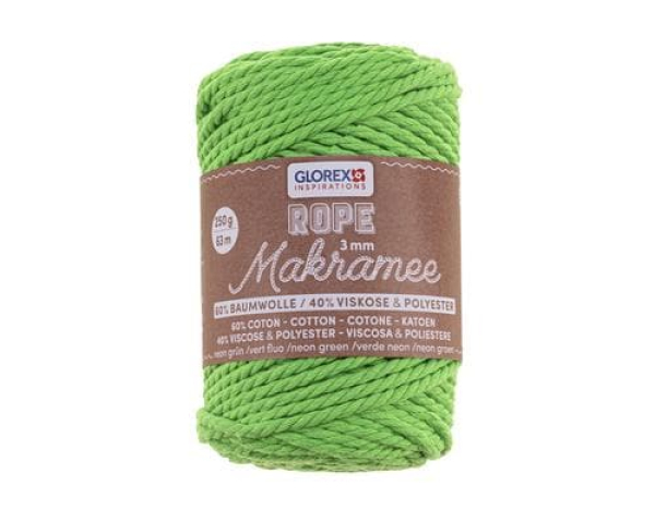 Glorex Wolle Makramee Rope gedreht 63 m x 3 mm, 250g, Neongrün / 3mm, 250g, 60% Cotton, 40% Viskose, negrün / Thema: Wolle