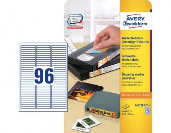 Avery Zweckform - Universal-Etiketten L6022REV 63.5 x 8.5 mm für VHS / Packung zu 25 Blatt / 2400 Etiketten / Thema: Etiketten