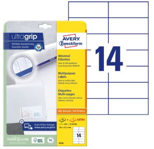 Avery Zweckform Universal-Etiketten 6136, 105 x 42.3 mm, 30 Blatt