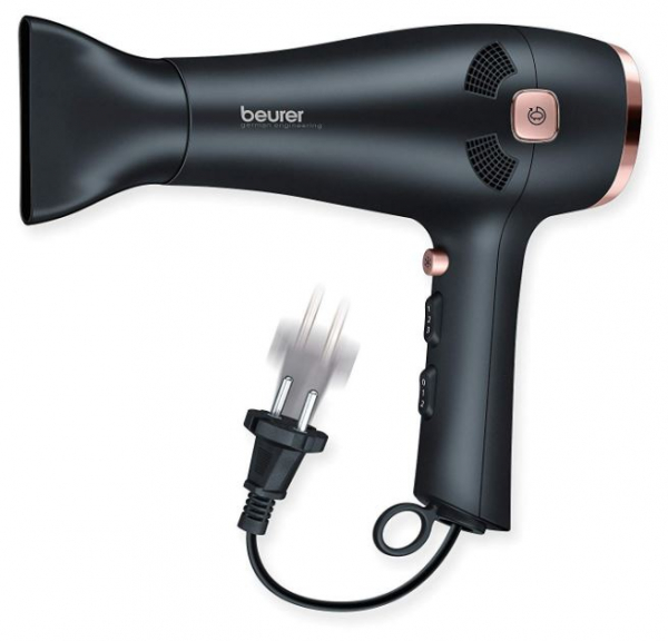 Der HC 55 Haartrockner von Beurer ist zum Trocknen und professionellen Stylen der Haare geeignet. Mit den zwei Gebläsestufen und den drei Heizstufen kann man den Haartrockner auf die individuellen Bedürfnisse einstellen. Die zusätzliche Kaltluftstufe sorgt für eine bessere Fixierung der Frisur. Mit der schmalen Profidüse kann man die Haare gezielt stylen, der Diffusor-Aufsatz verleiht dem Haar zusätzliches Volumen. Die integrierte Ionen-Technologie neutralisiert das Haar durch negativ geladene Ionen. Eine statische Aufladung der Haare wird verhindert. Eine Abschaltautomatik schützt das Gerät vor Überhitzung. Die abnehmbaren Filter erleichtern das Entfernen von angesaugten Fusseln, Staub und Haaren. Das Gerät verfügt über einen automatischen Kabeleinzug. Damit lässt sich das Kabel bequem in den Haartrockner einziehen.