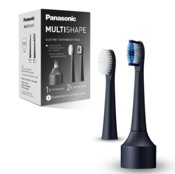 MultiShape Zubehör, Schallzahnbürsten-Aufsatz, mit Schutzkappe Der Aufsatz ER-CTB1 darf im Reisegepäck nicht fehlen, denn damit wird der Panasonic MultiShape im Handumdrehen zur elektrischen Schallzahnbürste. Zwei Bürstenköpfe reinigen gründlich Zähne, Zahnzwischenräume und Zahnfleisch. Während der ultrafeine Bürstenkopf mit seinen 0,02 mm feinen Borsten Plaque und Bakterien selbst aus den Zahnfleischtaschen schonend entfernt, ist der Multi-Fit-Kopf für die gründ¬liche Reinigung von Kauflächen und unebenen Zahnoberflächen geschaffen. Seine dreikantigen Randborsten reichen dabei sanft auch in die Zahnzwischenräume.