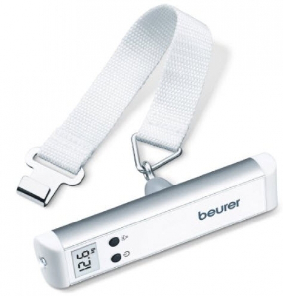 Die Kofferwaage LS 10 von Beurer eignet sich ideal zum genauen Wiegen des Gepäcks bei Flugreisen. Die LS 10 ist klein und handlich mit einem Gurt zum platzsparendem Verstauen. Die Kofferwaage besitzt eine Tragkraft von 50 kg und ist auch zum Abwiegen anderer Gegenstände einsetzbar. Hebt man die Waage zur Messung mit dem Gepäckstück horizontal nach oben. Das Gewicht wird auf dem gut ablesbaren LCD-Display angezeigt. Hold-Funktion: Ist das Gewicht stabil, blinkt die Anzeige 3-mal und wird fixiert. Die Waage piept 2-mal und „H“ wird angezeigt. Das Gewicht wird für weitere 2 Minuten angezeigt, dann schaltet die Waage automatisch ab. Die Kofferwaage verfügt über eine Taschenlampe und Überlastungsanzeige.