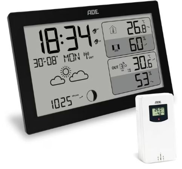 Die extra grosse WS2325 von ADE ist eine moderne Wetterstation für alle, die Wert auf ein gesundes Raumklima und zuverlässige Wetterinformationen legen. Der Aussensensor überträgt Temperatur- und Luftfeuchtigkeitswerte kabellos, während die Innenstation zusätzlich barometrische Wetterdaten auswertet animiert dargestellt mit Symbolen für Sonne, Wolken, Regen und Schnee. Auch die aktuelle Mondphase und ein Frostalarm werden angezeigt. Die Wetterstation bietet eine Lüftungsempfehlung über ein Fenster-Symbol, basierend auf Temperatur- und Feuchtigkeitswerten (innen/aussen, 2095?%). Die Memory-Funktion speichert Höchst- und Tiefstwerte. Weitere Funktionen: Funkuhr mit manueller Einstellung, ewiger Kalender mit Tagesanzeige in 7 Sprachen, Dual-Wecker mit Schlummer- und Wochenendfunktion. Die Uhrzeit lässt sich im 12-/24-Stunden-Format anzeigen. Einheiten umschaltbar: °C / °F.