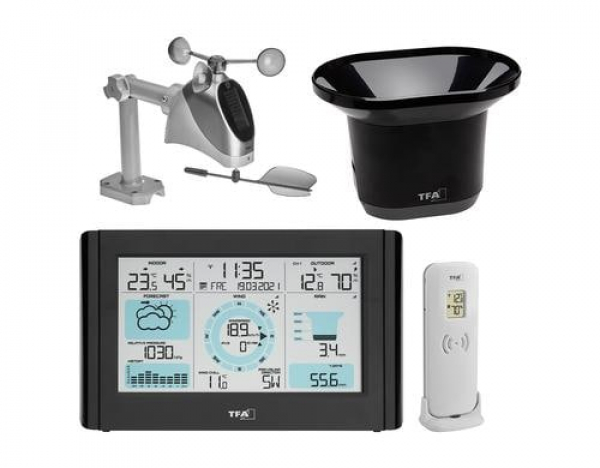 Wind, Regenmenge und Wetter selber messen, das geht mit der WEATHER PRO von TFA. Die Funk-Wetterstation hat einen Thermo-Hygro-Sender zur Kontrolle der Außentemperatur und Luftfeuchtigkeit, einen Windmesser für die Ermittlung der Windstärke und einen Regenmesser zur Bestimmung der Regenmenge am Aufstellort. Die Daten werden an die Basisstation gesendet und dort angezeigt. Mit einem Blick auf das farbig beleuchtete Display der SPRING BREEZE kann man sich ein umfassendes Bild von der aktuellen Wettersituation machen. Im Mittelpunkt steht die animierte Grafik für die Windstärke. Entsprechend der Windgeschwindigkeit dreht sich das kleine Windrad und die farbigen Balken blinken. Vergangenheitsdaten lassen sich über einen Zeitraum von einem Jahr zurückverfolgen. Sonne, Wolken oder Regentropfen – ein integriertes elektronisches Barometer misst den Luftdruck und auf Basis der Veränderungen gibt das Wettersymbol eine Prognose für das kommende Wetter. Auch die Raumtemperatur und Luftfeuchtigkeit hat man im Blick und kann das Raumklima durch gezieltes Heizen und Lüften kontrollieren. Die Wetterstation bietet noch viele zusätzliche Funktionen und Informationen. Es lassen sich Alarmgrenzen festlegen, Höchst- und Tiefstwerte abrufen sowie Taupunkt und Windchill-Temperaturen berechnen. Die aktuelle Uhrzeit und das Datum werden über das DCF 77 Funksignal empfangen. Das Farbdisplay hat zwei Helligkeitsstufen. Möchte man das Display dauerhaft beleuchten, verbindet man die Wetterstation mit dem Netzteil. Zwei weitere Sender zur Temperatur- und Luftfeuchtigkeitskontrolle, z.B. im Kinderzimmer, Schlafzimmer, Keller oder Garage, sind optional anschließbar.