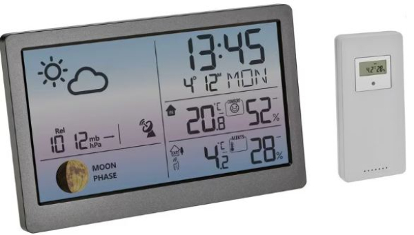 LUNA SKY zeigt Ihnen alles, was Sie über das Wetter wissen müssen. Die Besonderheit: Die übersichtlich angeordneten Wetterinformationen erscheinen auf einem Hintergrund aus zarten Blau-Gelb-Violett-Tönen, der an die Abenddämmerung erinnert und auf Knopfdruck leuchtet. Dann erstrahlt auch der Mond goldgelb mit Oberflächendetails und gibt an, in welcher Phase wir ihn derzeit am Himmel sehen. Über bis zu drei Funksender holt sich die LUNA SKY die aktuelle Aussentemperatur und Luftfeuchtigkeit. Ein interner Sensor misst den Luftdruck und beobachtet die Veränderungen. Aus diesen Daten zieht die Station Rückschlüsse darauf, wie sich das Wetter in der nächsten Zeit entwickeln wird und setzt das in anschauliche Symbole und einen Tendenzpfeil um. Gleichzeitig behalten Sie mit LUNA SKY die Innentemperatur, die Luftfeuchtigkeit und die Komfortstufe am Aufstellort im Blick. Über Funk wird die exakte Uhrzeit automatisch eingestellt und dank der Weckfunktion in zwei verschiedenen Lautstärken können Sie LUNA SKY auch als Wecker nutzen, inklusive Snooze-Funktion. Die Station nutzt fünf handelsübliche AAA-Batterien als Stromquelle für die Basisstation und den mitgelieferten Sender. (Batterien sind nicht im Lieferumfang enthalten.