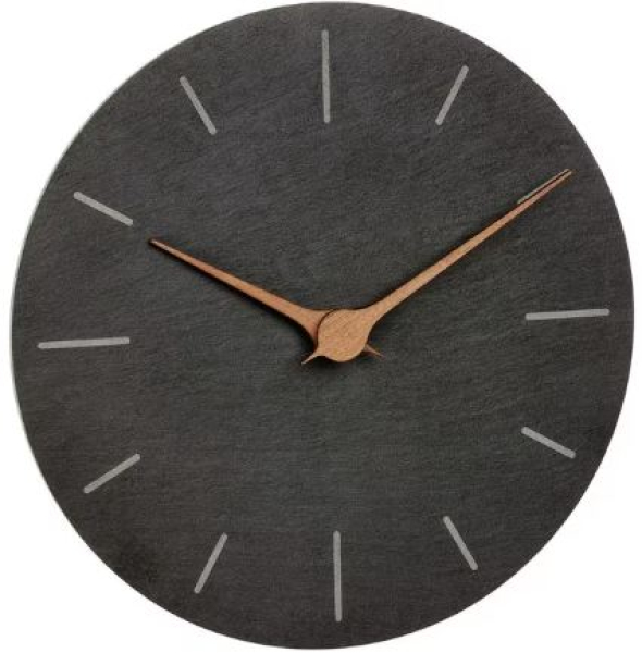 Diese Wanduhr mit ihrem Ziffernblatt aus echtem Schiefer bringt ein natürliches und gleichzeitig edles Flair in Ihr Wohnambiente. Durch die einzigartige Maserung des Gesteins ist jede Uhr ein Unikat. Um die natürliche Schönheit dieser Wanduhr beizubehalten, sind die Stundenmarkierungen dezent auf dem Ziffernblatt eingraviert. Stimmig dazu wirken die originellen Zeiger aus Walnussholz. Auch das Herzstück der Uhr überzeugt durch Qualität und Nachhaltigkeit. Das energiesparende Qualitäts-Uhrwerk geht mit einer Abweichung von weniger als 0,5 Sekunden am Tag wesentlich genauer als andere handelsübliche Quarz-Uhrwerke. Durch die lange Laufzeit muss der Batteriewechsel nur etwa alle drei Jahre vorgenommen werden. Die Zeiger gleiten fast geräuschlos über das Ziffernblatt und stören nicht durch lästiges Ticken beim Schlafen, Lernen oder Lesen.