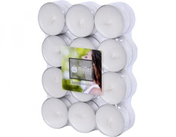 müller Kerzen Duftkerze Anti Tobacco 24 Stück / weiss 1.5x3.9 cm, in Aluhülse / Thema: Duftkerzen