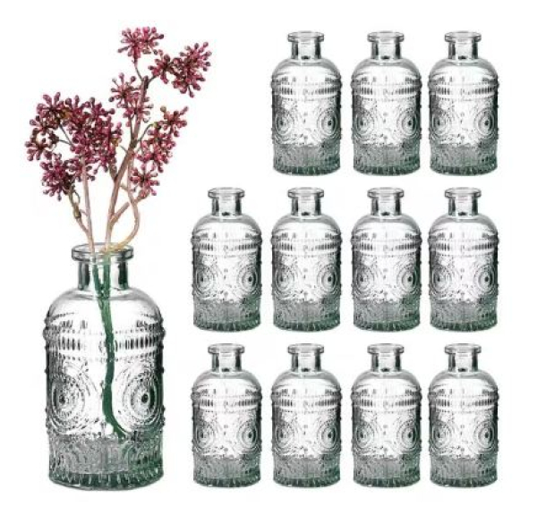 Vasen erzählen Geschichten. Stell Dir vor, wie jede dieser Glasvasen einen Hauch Nostalgie in Dein Zuhause bringt. Ob als Tischdeko mit Trockenblumen, einzelnen Zweigen oder für Deine liebsten Fundstücke vom Spaziergang diese Mini-Vasen im grossen 12er Set sind für alles zu haben. Ihre klare Form, das robuste Glas und die charmante Prägung machen sie zu wahren Blickfängen. Du brauchst nur eine Blume und ein wenig Fantasie und schon entsteht etwas Schönes, das mehr ist als nur Dekoration.Glasvasen im 12er Set - Gesamtmasse H x D: ca. 13 x 6 cm- Volumen: ca. 240 ml- Öffnung D: ca. 2 cm- Gewicht: ca. 200 g- Material: Glas- In verschiedenen FarbenFlaschenvasen für Tischdeko - Ideal für Tischdekoration auf Hochzeiten, Feiern oder im Alltag- Geeignet für Trockenblumen, einzelne Zweige oder Gräser- Im geprägtem Vintage-Design für charmante Akzente- Aus hochwertigem Glas gefertigt mit dickem Boden- Kombinierbar im Ensemble oder einzeln platzierbarLieferumfang - 12x Nostalgie-Vasen in gewählter Farbe- Dekorationsartikel nicht im Lieferumfang enthalten