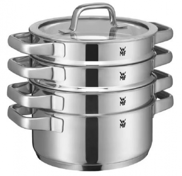 Die Kollektion Compact Cuisine von WMF begeistert mit ihrer einerseits wunderschönen und andererseits besonders kompakten und intelligent-platzsparenden Formgebung, die sogar das Stapeln von bis zu 4 Kochgeschirren desselben Durchmessers ermöglicht. Interne Vergleichstests mit anderen Topf-Sets, Schüsseln und Dampfgareinsätzen von WMF ergaben, dass gestapelte Compact Cuisine Kochgeschirre (ausgenommen Pfannen und Deckel) mit identischen Durchmessern so bis zu 30 Prozent weniger Platz im Küchenschrank benötigen als dies bei anderen Serien der Fall ist. Damit ist Compact Cuisine eine smarte Lösung um Platz zu sparen und in Küchenschränken Ordnung zu halten. Dieses 4-teilige Compact Cuisine Set macht da natürlich keine Ausnahme. Alle Teile sind dazu aus strapazierfähigem und elegantem Cromargan gefertigt und verfügen über wärmereduzierende** ** Hohlgriffe. Die Töpfe bieten zusätzlich den energiesparenden TransTherm-Allherdboden und einen breiten Schüttrand zum tropffreien Ausgiessen von Flüssigkeiten. Und selbstverständlich sind sie mitsamt der zugehörigen Glasdeckel spülmaschinengeeignet.