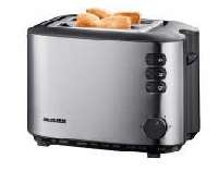 Mit dem Severin Toaster AT 2514 kann man sowohl Toasten als auch Auftauen und Erwärmen. Im Toaster AT 2514 finden zwei Toastscheiben gleichzeitig ihren Platz. Die Röstzeitelektronik mit Temperatursensor garantiert den genau richtigen Röstgrad, den man natürlich vorher über den Drehschalter eingestellt hat. Die Defrosterstufe und die Aufwärmstufe werden jeweils mit einer Kontrollleuchte angezeigt. Die Toastscheibenzentrierung sorgt für die gleichmäßige Bräunung beider Seiten, während die Lift-Funktion zur leichteren Entnahme der Toastscheiben dient. Sicherheitshalber gibt es noch eine separate Auslösetaste mit Kontrollleuchte. Mit Krümelschublade, integriertem Brötchen-Röstaufsatz, dem wärmeisolierenden Edelstahlgehäuse und der Kabelaufwicklung lässt der Toaster AT 2514 keine Wünsche offen.