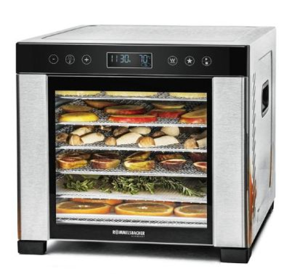 Ob Obst, Gemüse, Kräuter, Fleisch oder Fisch – mit den ROMMELSBACHER Dörrautomaten nutzen Sie die älteste Form der Lebensmittelkonservierung, allerdings auf die moderne Art. Den Nahrungsmitteln wird dabei auf schonende Weise die Feuchtigkeit entzogen. Vitamine, Mineral- und Ballaststoffe werden dabei weitestgehend erhalten, das Ergebnis ist 100% natürlich, ohne Zusatz- und Konservierungsstoffe. So stellen Sie ganz einfach und sicher Ihre eigenen Snacks her, die sowohl lecker als auch gesund sind. Die Möglichkeiten sind vielfältig: Fruchtleder, Gemüsechips, Trockenfrüchte, Dörrfleisch, aber auch Leckerlis für Tiere oder schöne (Weihnachts-)Dekorationen lassen sich damit zaubern. Für das gleichmässige und beständige Trocknen auf allen Ebenen sorgt ein innen befindlicher Ventilator. Ein wesentlicher Vorteil dieser Geräte für eine Vielzahl an Dörrvariationen ist der dabei einstellbare Temperaturbereich von 35–75 °C mit einer zusätzlichen 24-Stunden-Zeitschaltuhr und automatischer Abschaltfunktion. Die Bedienung erfolgt kinderleicht über Touch-Control-Sensoren mit einem übersichtlichen LED-Display an der Front. Dank des doppelwandigen Edelstahlgehäuses der Dörrautomaten besteht eine hervorragende Wärmeisolation, die wiederum den Energieverbrauch niedrig hält. Um direkt loszulegen, ist das passende Zubehör inklusive, wie Dörrtabletts, Dörrgitter und Dörrunterlage. Ob normalgross oder in XXL – beide Geräte passen perfekt zu einer bewusst gesunden Ernährung!