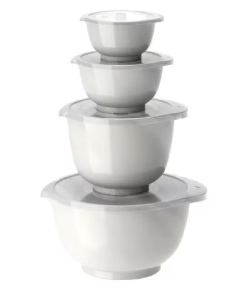Margrethe Rührschüssel-Set von Rosti in vier der beliebtesten Grössen. Das Set enthält 0.25 + 0.5 + 1.5 + 3 Liter Margrethe Schüsseln mit Deckel. Die Margrethe Schüssel ist die klassische Rührschüssel mit sicherem Griff, praktischem Ausguss und rutschfestem Bodenring. Die neue Version der Margrethe-Schüssel besteht aus Durostima, einem recycelbaren Kunststoff. Die Schüssel ist jetzt noch stabiler und bruchsicherer und dank des neuen Materials auch mikrowellen- und gefriergeeignet. Margrethe ist ideal für die Zubereitung und das Servieren von Speisen, und mit einem zusätzlichen Deckel wird die Schüssel zu einer praktischen Aufbewahrungsschüssel.