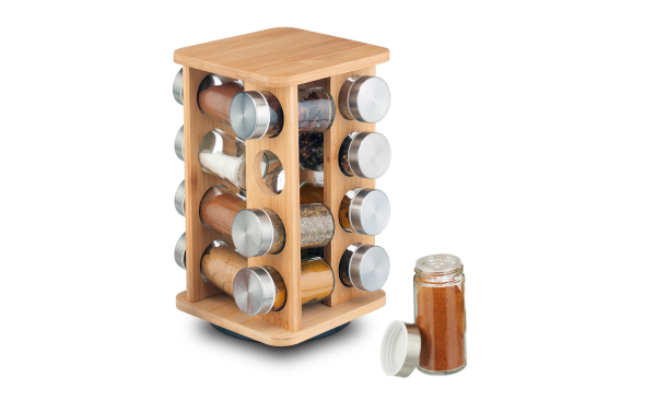 relaxdays Gewürzkarussell 16er Set Hellbraun/Silber/Transparent / Bambus, Edelstahl, mit 16 Gläser / Thema: Küchenutensilienhalter