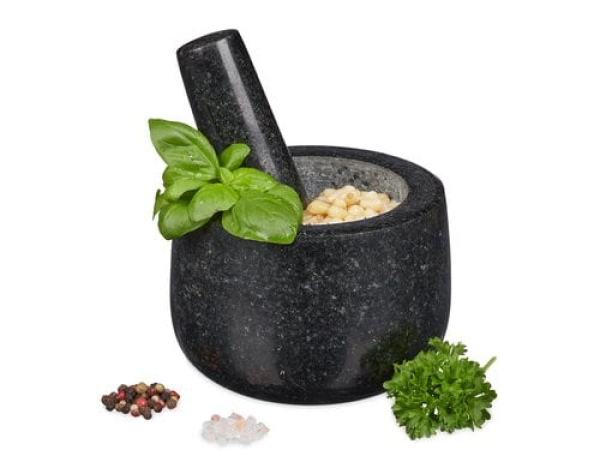 relaxdays Mörser mit Stössel 12 cm, Granit / Granit, 300ml / Thema: Mörser