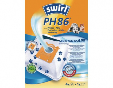 Die Staubsaugerbeutel PH86 NeutralizAir sind zusätzlich mit einem Aktivkohle Pad ausgestattet, das unangenehme Gerüche (z.B. von Tierhaaren) in der Abluft des Saugers vermindert. Sie eignen sich besonders zur Verwendung in Tierhaushalten. Die Beutel mit MicroPor Plus Anti-Allergen-Filter schließen nicht nur normalen Hausstaub, sondern auch allergenen Feinstaub wie Schimmelsporen, Milbenkot, Bakterien und Pollen fest im Beutel ein. Die Raumluft wird von allergenem Feinstaub entlastet. Mit dem Dirtlock Staubverschluss lässt sich der volle Beutel beim Wechseln einfach verschließen. Das verhindert, dass beim Wechseln des Staubsaugerbeutels Feinstäube wieder zurück in die Raumluft gelangen. Der Volumen-Staubspeicher der MicroPor Plus Staubsaugerbeutel verhindert, dass der Beutel verstopft, und ermöglicht eine lange Nutzungsdauer. Die abgerundeten Ecken der MicroPor Staubsaugerbeutel gewährleisten eine hohe Passgenauigkeit des Beutels, damit der Staubraum des Saugers optimal ausgenutzt werden kann. Die Swirl Staubsaugerbeutel PH86 NeutralizAir mit dem Pro Nature Siegel bestehen außerdem aus 40% Recyclingmaterial und nachwachsenden Rohstoffen. Damit leisten sie ihren Beitrag, um Umwelt und Ressourcen zu schonen. Die Packung enthält vier Staubsaugerbeutel und einen Abluft-Filter, passend für verschiedene Modelle der Marken Philips, AEG, Electrolux, Volta.
