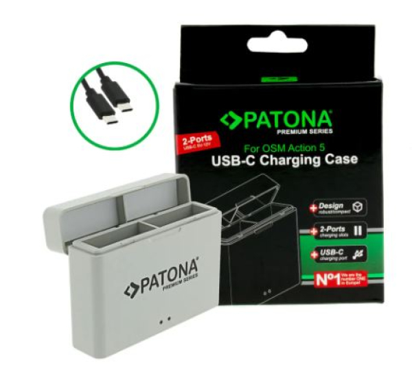 Mit der PATONA Premium 2-fach Ladebox für DJI Osmo Action 3, 4 und 5 haben Sie eine kleine handliche Box, in der Sie bis zu zwei Akkus gleichzeitig aufladen und aufbewahren können. Der Klick-Verschluss verhindert, dass die Akkus versehentlich herausfallen. Main Features: 2 Ladeschächte: Laden Sie bis zu zwei Akkus gleichzeitig auf. Aufbewahrung: Hält Ihre Akkus geordnet und geschützt, wenn Sie diese nicht verwenden. USB-C Eingang: Bequeme Stromversorgung über den USB-C Anschluss. Kompakt und leicht: 52g. Ladestatus: Individuelle LED-Anzeigen für jeden Steckplatz zeigen den Ladestatus an. Intelligentes Lademanagement: Sorgt für sicheres und effizientes Laden. Technische Daten: Input: USB-C 5-12V/ 2A Output: 4,5V/3A (x1) / 1,5A (x2) Gewicht: 52g Größe: 8,18 x 6,14 x 2,07 cm (L x B x H) Passend für folgende Kameratypen:: DJI Osmo Action 3, Osmo Action 4, Osmo Action 5 Passend für folgende Akkumodelle: DJI BCX202