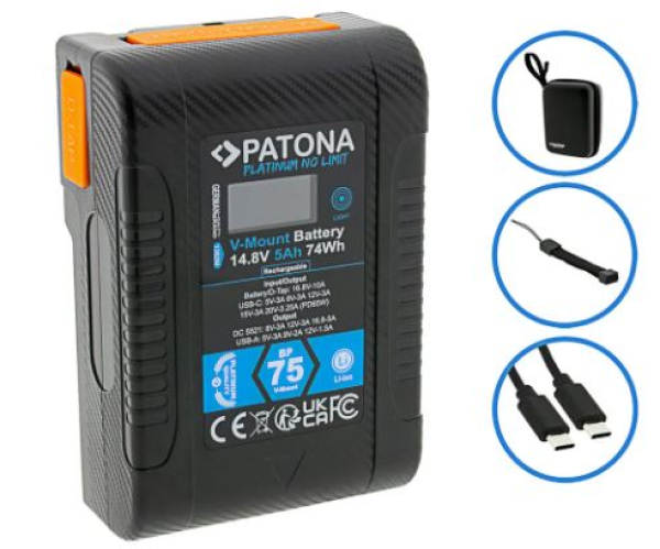 Der PATONA Platinum V-Mount Akku BP-75W mit USB-C ist die perfekte mobile Energiequelle für professionelle Kameras, Monitore und weitere Geräte. Dank USB-C 65W Power Delivery (PD) Input & Output kann er nicht nur Kameras, sondern auch Laptops, Tablets; Monitore und Smartphones mit bis zu 65W versorgen. Neben V-Mount bietet er vielseitige Anschlüsse wie D-Tap, USB-A, USB-C und DC, ideal für den flexiblen Einsatz. Ein integriertes Display zeigt Ladezustand und Leistung in Echtzeit an. Mit hoher Kapazität, schneller Ladefunktion und umfassenden Sicherheitsmechanismen ist er der ideale Begleiter für Filmproduktionen und Content Creators. Technische Daten: Modell: PATONA Platinum V-Mount Akku BP-75W Typ: Li-Ion Kapazität: 14,8V / 5.000mAh / 74Wh Abmessungen: 11,89 x 7,99 x 4,27cm (L x B x H) Gewicht: 468g Input Akku/D-Tap: 16.8V/10A Input USB-C: 5V/3A, 9V/3A, 12V/3A, 15V/3A, 20V/3.25A (PD65W) Output USB-C: 5V/3A, 9V/3A, 12V/3A, 15V/3A, 20V/3.25A (PD65W) Output USB-A: 5V/3A, 9V/2A, 12V/1.5A Output DC 5521: 8V/3A, 12V/3A, 16.8V/5A Arbeitstemperatur: 0°C bis 45°C, Ladetemperatur: -10°C bis 60°C Lagertemperatur: -10°C bis 50°C Lieferumfang: 1x PATONA Platinum V-Mount Akku BP-75W 1x PATONA Platinum Hardcase 1x Kabel USB-C auf USB-C 1x Karte mit QR-Code zur Bedienungsanleitung