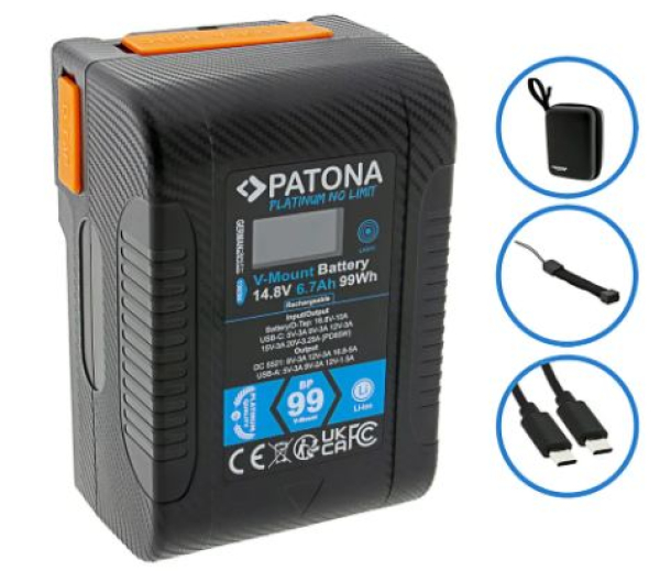 Der PATONA Platinum V-Mount Akku BP-99W mit USB-C ist die perfekte mobile Energiequelle für professionelle Kameras, Monitore und weitere Geräte. Dank USB-C 65W Power Delivery (PD) Input & Output kann er nicht nur Kameras, sondern auch Laptops, Tablets; Monitore und Smartphones mit bis zu 65W versorgen. Neben V-Mount bietet er vielseitige Anschlüsse wie D-Tap, USB-A, USB-C und DC, ideal für den flexiblen Einsatz. Ein integriertes Display zeigt Ladezustand und Leistung in Echtzeit an. Mit hoher Kapazität, schneller Ladefunktion und umfassenden Sicherheitsmechanismen ist er der ideale Begleiter für Filmproduktionen und Content Creators. Technische Daten: Modell: PATONA Platinum V-Mount Akku BP-99W Typ: Li-Ion Kapazität: 14,8V / 6.700mAh / 99Wh Abmessungen: 11,89 x 7,99 x 6,06cm (L x B x H) Gewicht: 608g Input Akku/D-Tap: 16.8V/10A Input USB-C: 5V/3A, 9V/3A, 12V/3A, 15V/3A, 20V/3.25A (PD65W) Output USB-C: 5V/3A, 9V/3A, 12V/3A, 15V/3A, 20V/3.25A (PD65W) Output USB-A: 5V/3A, 9V/2A, 12V/1.5A Output DC 5521: 8V/3A, 12V/3A, 16.8V/5A Arbeitstemperatur: 0°C bis 45°C, Ladetemperatur: -10°C bis 60°C Lagertemperatur: -10°C bis 50°C Lieferumfang: 1x PATONA Platinum V-Mount Akku BP-99W 1x PATONA Platinum Hardcase 1x Kabel USB-C auf USB-C 1x Karte mit QR-Code zur Bedienungsanleitung