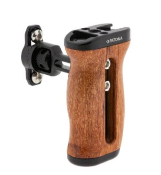 "PATONA Universal-Handgriff für Kamerakäfige" Eigenschaften: - Aluminiumlegierung, - Griff aus Holz, - höhenverstellbar, Unser PATONA Universal-Handgriff wird aus einer leichten robusten Aluminiumlegierung gefertigt und besitzt eine Ummantelung aus Holz, welches durch die spezielle Form gut in der Hand liegt. Der PATONA Universal-Handgriff Handgriff besitzt eine Kaltschuhhalterung, an der sich Zubehör, mit Schnellmontageplatte befestigen lässt. Der PATONA Universal-Handgriff wird mit 2 1/4-20 Zoll Schrauben an einem Kamerakäfig befestigt und ermöglicht Ihnen, durch die höhenverstellbare Halterung, ein bequemes und weniger ermüdendes Handling Ihrer Kamera. Technische Details: Material: Aluminiumlegierung und Holz, Montagehalterung: 2x 1/4 Zoll Schraube und Kaltschuhhalterung, Gewicht: 159,1g, Maße: 95 x 90 x 55 mm