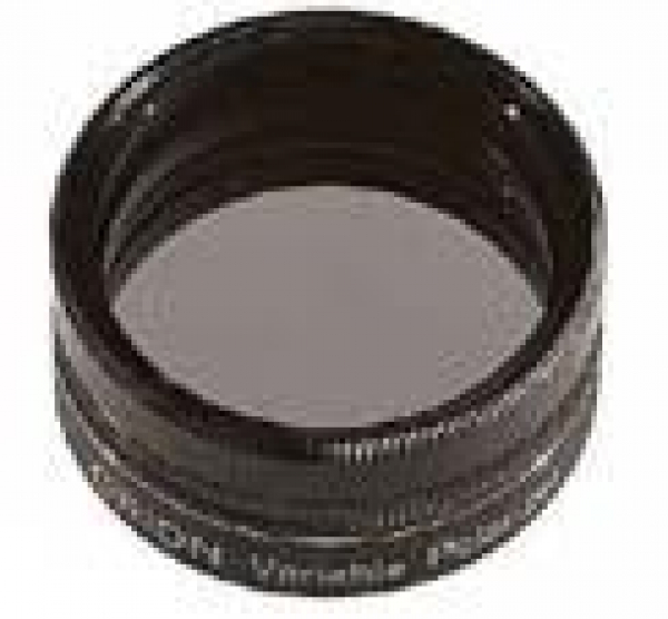 1,25" Variabler Polarisationsfilter, 1% bis 40% Transmission - stufenlos. Der Filter wird einfach in das 1,25"-Filtergewinde des Okulares oder des Adapters geschraubt. Ein Teil des Filters ist drehbar gelagert. Durch das Verdrehen des unteren Teils können Sie die Filterwirkung verändern. Sie können die Dämpfungswirkung optimal an das Objekt und an die Vergrößerung anpassen. Der variable Polfilter ist für nahezu jeden Anwendungsbereich gedacht, von Objekten im Sonnensystem bis zu der Beobachtung von Doppelsternen, wo man individuell die Helligkeit dämpfen kann und so eine Überstrahlung der kleineren Komponente durch den Hauptstern verhindern kann. Kombination aus zwei linearen Polarisationsfiltern - drehbar zueinander gelagert. Durch die Verdrehung der Filter zueinander kommt es zur variablen Filterwirkung. Fassung mit beidseitigem Filtergewinde. Substratdicke 2mm