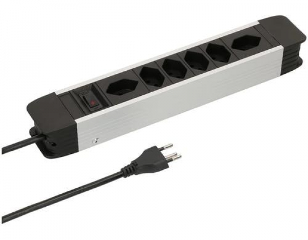 Max Hauri Steckdosenleiste 6 x T13 mit Schalter / 6xT13, mit Schalter, sz/alu, 2m Kabel / Thema: Steckerleisten