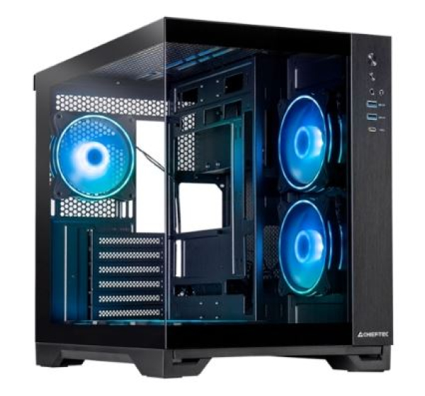 CHIEFTEC Visio verfügt über gehärtete Glasplatten auf der linken und der Vorderseite und verfügt über ein Zweikammer-Layout für die neuesten Back-Connect-Motherboards (kompatibel mit ASUS BTF und MSI Project Zero). Dieses Design optimiert das Kabelmanagement für eine saubere Innenansicht und ungehinderten Luftstrom. Das verfeinerte interne Layout unterstützt die Montage von 360-mm-Radiatoren an der Ober- und Unterseite, 240-mm-Radiatoren an der Motherboardseite und CPU-Tower-Kühlern mit einer Höhe von bis zu 175 mm. High-End-GPUs mit bis zu 410 mm können dank seiner geräumigen und gut belüfteten Konfiguration problemlos untergebracht werden. Das Gehäuse wird mit sechs vorinstallierten 120-mm-A-RGB-Lüftern und einem Control Hub zur Motherboard-Synchronisierung von A-RGB und PWM-Lüftergeschwindigkeitsregelung geliefert. 5 dieser Lüfter sind mit Lüfterblättern mit umgekehrtem Luftstrom ausgestattet, um eine optimale Luftzufuhr an den Seiten und der Unterseite zu ermöglichen, ohne die Ästhetik zu beeinträchtigen. Der CHIEFTEC Visio wurde speziell für Gamer entwickelt und bietet die Möglichkeit, ein unverwechselbares System zu erstellen.
