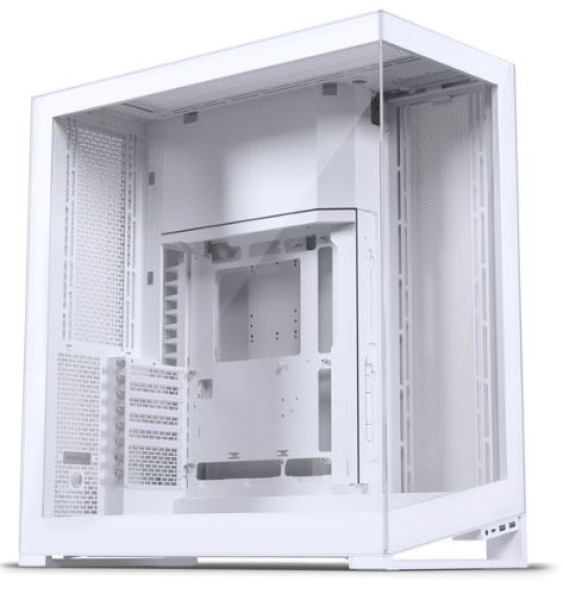 Showcase-Gehäuse in Weiss, mit Seitenteil und Front aus Tempered Glass, exzellenter Airflow dank sehr feinem Mesh, bis zu 12x 120er- oder 11x 140er-L
