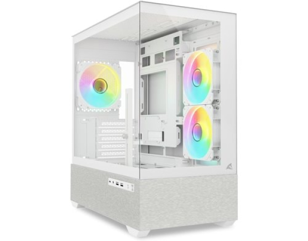Mit seinem stilvollen Stoffüberzug unter dem Seitenteil und der Front aus gehärtetem Glas, verleiht das MK7 ARGB deiner Gaming-Hardware eine besonders elegante Note – und das bei minimiertem Platzverbrauch. Mit drei vorinstallierten ARGB-Lüftern und einem durchdachten Lufteinzug über die Seite ist auch für einen jederzeit berauschenden Airflow gesorgt. Das Micro-ATX-Gehäuse bietet zudem moderne Anschlüsse, eine BTF-Mainboard-Kompatibilität und jede Menge Platz für leistungsstarke Technik. Das MK7 ARGB setzt mit einer modernen Glasoptik auf minimalem Raum Hardware perfekt in Szene. Ein edler Touch wird ihm zusätzlich durch den stilvollen Stoffüberzug an der Unterseite verliehen. Im AK7 ARGB sind bereits drei 120-mm-ARGB-PWM-Lüfter verbaut, von denen zwei invertiert sind, um die Luft von der Seite ins Gehäuse zu saugen und so für einen optimalen Airflow zu sorgen. Das Gehäuse bietet dabei Platz für insgesamt bis zu acht Lüfter. Wer sein MK7 ARGB mit einer Wasserkühlung betreiben möchte, kann dies selbstverständlich tun und neben einem 360-mm-Radiator sogar einen weiteren Radiator von bis zu 240 mm unterbringen. Das MK7 ARGB ist nicht nur mit herkömmlichen Mini-ITX- und Micro-ATX-Mainboards kompatibel, sondern unterstützt auch das neue BTF-Format. Für eine hohe Kompatibilität sorgt das MK7 ARGB mit modernen TRRS- und USB-C-Anschlüssen. Eine RGB-Steuerung ermöglicht zudem den Anschluss von bis zu vier LED-Elementen und vier PWM-Lüftern. Mit einer maximalen Grafikkartenlänge von 410 mm bietet das MK7 ARGB auch Platz für große Karten, die durch einen gummierten Grafikkartenhalter zusätzlich gestützt werden. CPU-Kühler können eine Höhe von bis zu 170 mm und Netzteile eine Länge von bis zu 235 mm haben. Zudem finden bis zu zwei 3,5“-HDDs oder drei 2,5“-SSDs im Gehäuse Platz.