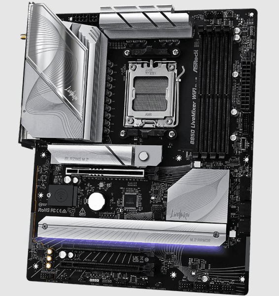 Das ASRock B850 LiveMixer WiFi basiert auf dem AMD B850 Chipsatz und unterstützt AMD-Prozessoren für den Sockel AM5. Es verfügt über vier DDR5-Slots für bis zu 256 GB Arbeitsspeicher. Zur weiteren Ausstattung des B850 LiveMixer WiFi gehören ein PCIe-5.0-x16-Slot und zwei PCIe-4.0-x16-Slots. Außerdem verfügt das B850 Steel Legend WiFi über 8-Kanal-Sound, eine 2,5 Gigabit-LAN-Schnittstelle, WiFi 7, Bluetooth 5.4, zwei SATA3-Anschlüsse, drei M.2-Anschlüsse und eine Reihe an USB-Schnittstellen.