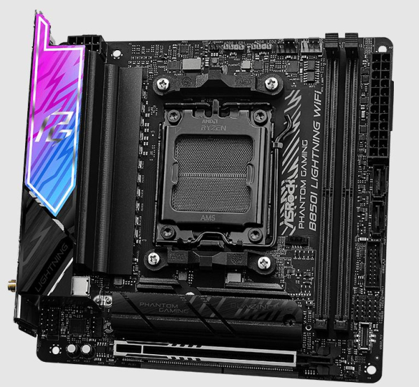 Das ASRock B850I Lightning WiFi basiert auf dem AMD B850 Chipsatz und unterstützt AMD-Prozessoren für den Sockel AM5. Es verfügt über zwei DDR5-Slots für bis zu 128 GB Arbeitsspeicher. Zur weiteren Ausstattung des B850I Lightning WiFi gehört ein PCIe-5.0-x16-Slot. Außerdem verfügt das B850I Lightning WiFi über 8-Kanal-Sound, eine 2,5 Gigabit-LAN-Schnittstelle, Wi-Fi 6E, Bluetooth 5.2, zwei SATA3-Anschlüsse, zwei M.2-Anschlüsse und eine Reihe an USB-Schnittstellen.