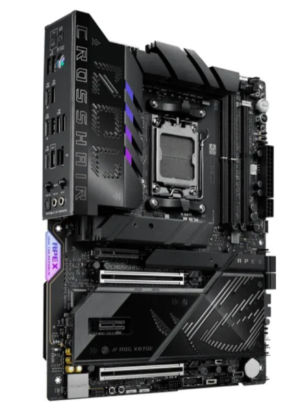 Das ASUS ROG CROSSHAIR X870E APEX basiert auf dem AMD-X870E-Chipsatz und unterstützt AMD-Prozessoren für den Sockel AM5. Es verfügt über zwei DDR5-Slots für bis zu 128 GB Arbeitsspeicher. Zur weiteren Ausstattung des ASUS ROG CROSSHAIR X870E APEX gehören ein PCIe-5.0-x16-Slot und ein PCIe-4.0-x16-Slot (x8 Lanes). Außerdem verfügt das ASUS ROG CROSSHAIR X870E APEX über 8-Kanal-Sound, eine 10 Gigabit-LAN-Schnittstelle, eine 5 Gigabit-LAN-Schnittstelle, WiFi 7, Bluetooth 5.4, vier SATA3-Anschlüsse, drei M.2-Anschlüsse und eine Reihe an USB Schnittstellen.