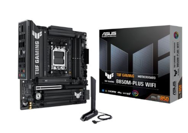 Das ASUS TUF GAMING B850M-PLUS WIFI basiert auf dem AMD B850 Chipsatz und unterstützt AMD-Prozessoren für den Sockel AM5. Es verfügt über vier DDR5-Slots für bis zu 192 GB Arbeitsspeicher. Zur weiteren Ausstattung des ASUS TUF GAMING B850M-PLUS WIFI gehören ein PCIe-5.0-x16-Slot und eine PCIe-4.0-x16. Außerdem verfügt das ASUS TUF GAMING B850M-PLUS WIFI über 8-Kanal-Sound, eine 2,5 Gigabit-LAN-Schnittstelle, WiFi 6E, Bluetooth 5.3, vier SATA3-Anschlüsse, drei M.2-Anschlüsse und eine Reihe an USB-Schnittstellen.