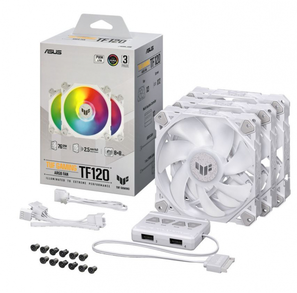 Das Lüfter-Set ASUS TUF Gaming TF120 ARGB-Gehäuselüfter White Edition 3IN1 besteht aus 3x leise adressierbare ARGB-Lüftern und einem ARGB-Controller. Das fortschrittliche dynamische Gleitlager ermöglicht eine lange Betriebsdauer. Die PWM-Steuerung mit extrem breitem Drehzahlbereich ermöglicht eine optimale Kühlung für alle Arten von Workflows. Die Anti-Vibrations-Pads reduzieren das Lüftergeräusch, indem sie Klappern und Vibrationen dämpfen. Ein doppellagiges LED-Array erzeugt eine hohe Farbsättigung und mehr Lichteffekte als herkömmliche RGB-Lüfter. Ein mitgelieferter ARGB-Hub verbindet bis zu vier Lüfter und bietet eine integrierte Beleuchtungssteuerung und Aura Sync-Unterstützung.