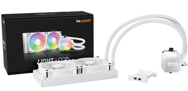 Die Light Loop 240mm aus dem Hause be quiet! ist eine leistungsfähige All-in-One-Wasserkühlung mit beleuchtetem ARGB-Kühlblock aus Aluminium. Mit ihren zwei Light Wings LX PWM High Speed-Lüftern, die jeweils 16 integrierte LEDs haben, liefert sie auch in übertakteten Systemen genug Kühlleistung. Dazu tragen auch die Pumpe mit fortschrittlichem, Schaltgeräusche reduzierendem IC und die speziell entwickelten Jet Plate und Cold Plate bei. Die Jet Plate aus Metall erhöht den Druck der Kühlflüssigkeit und sorgt damit für eine verbesserte Leistung. Die Cold Plate mit einer hohen Lamellendichte erhöht die Kühlleistung auf modernen High-End-CPUs. Der mitgelieferte ARGB-PWM-Hub ermöglicht die Synchronisation von bis zu sechs ARGB-Komponenten und PWM-Lüftern. Über den leicht zugänglichen Refill-Port fällt die Wartung dieser Wasserkühlung leicht - eine Flasche Kühlflüssigkeit ist ebenfalls im Lieferumfang enthalten.
