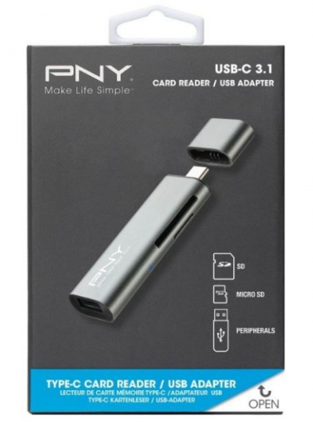 PNY USB-C CardReader - USB-C 3.1 Gen 1-Stecker / USB2 MicroSDXC- & SDXC-Steckplätze / USB-A 3.1 Gen 1-Anschluss