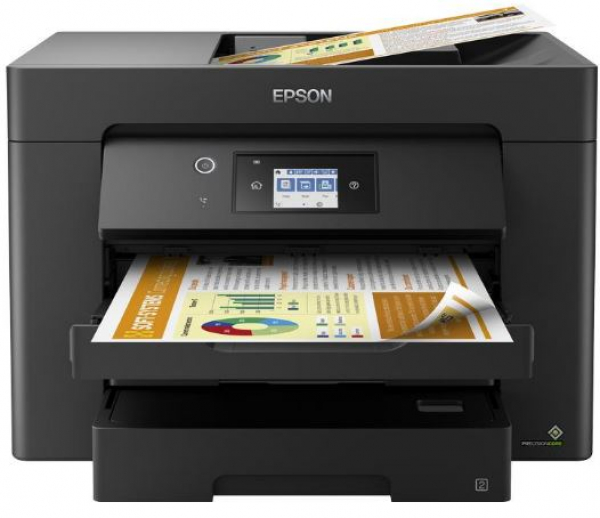 Der WorkForce WF-7830DTWF ist eine Multifunktions-Druckstation für professionelle Ausdrucke, Scans oder Kopien bis zum Format DIN A3. Neben einem Drucker für eine Seitenleistung von bis zu 32 Seiten pro Minute Schwarzdruck und bis zu 22 Seiten pro Minute Farbdruck sind ein Kopierer ein Scanner und eine Faxschnittstelle integriert. Vorlagen können dabei über den bis zu 50 Blatt DIN A3 fassenden, duplexfähigen Einzug an der Oberseite zugeführt werden. Mit Schnittstellen für USB, LAN, WLAN und Wi-Fi direct printing ist der WorkForce WF-7830DTWF äußerst flexibel einsetzbar. Er druckt mit professionellen Durabrite Ultra-Tintenpatronen, deren Reichweite sich durch optional erhältliche XL-Patronen noch deutlich erhöhen lässt. Die Bedienung erfolgt über einen Touchscreen an der Vorderseite.