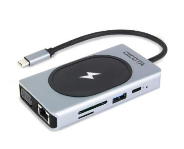 Erweitern Sie den USB-Anschluss Ihres Computers über den integrierten USB-C-Anschluss. Das integrierte kabellose Lademodul auf der Oberseite lädt Geräte mit bis zu 15 W auf. Dank der eingebauten HDMI- (4K) und VGA-Anschlüsse (1080p) können Sie diesen Hub an einen Monitor mit hoher Auflösung anschließen. Sie können auch Ihre Kopfhörer oder Ihr Audiogerät über ein einziges Kabel anschließen. Das Gerät verfügt außerdem über USB-C-Power Delivery mit bis zu 100 W, mit dem Sie ein angeschlossenes Notebook oder Tablet über Ihren Original-Netzadapter mit Strom versorgen können. Mit dem RJ-45 LAN-Anschluss mit bis zu 1000 Mbit/s können Sie Computer an Ethernet-Netzwerke anschließen. SD- und microSD-Kartensteckplätze sind für die Übertragung von Dateien mit Geräten wie Kameras eingebaut. Der DICOTA-Hub ist kompatibel mit Mac, Windows und anderen USB-C-fähigen Geräten. Dank der Plug & Play-Spezifikation ist keine zusätzliche Gerätekonfiguration erforderlich.
