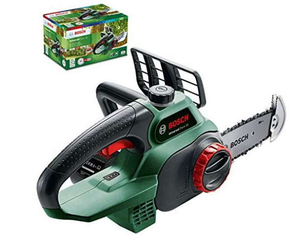 Die Bosch Akku-Kettensäge UniversalChain 18 solo eignet sich ideal zum Sägen von Ästen, zum Schneiden von Brenn- oder Rundholz, oder zur Abfallentsorgung. Der stabilisierende Führungsschutz mit Stahlkrallen greift in das Holz und sorgt für saubere Unterschnitte mit minimalen Astschäden. Das SDS-System von Bosch ermöglicht das werkzeuglose einfache Spannen und Wechseln der Sägekette. Die leichte und handliche UniversalChain 18 solo verfügt über ein automatisches Ölsystem, das für eine optimale Schmierung der Kette sorgt. Der Ölstand kann durch ein Sichtfenster überwacht werden. Mit der stabilen Rückschlagbremse zum wirkungsvollen Stoppen der Kette sorgt die UniversalChain 18 solo für die erforderliche Sicherheit beim Arbeiten.
