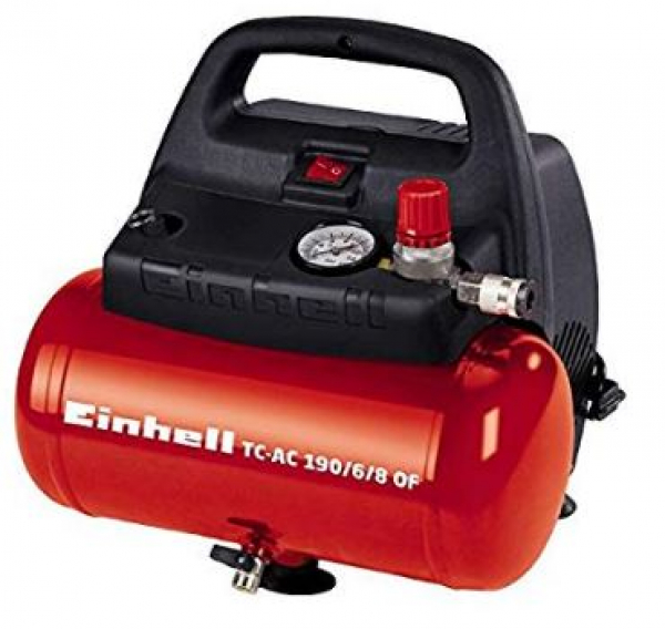 Der TC-AC 190/6/8 OF von Einhell ist ein äußerst mobiler und kompakter Kompressor, der mit seinen kleinen Abmessungen und 8 bar Betriebsdruck bei einer Vielzahl von Druckluftarbeiten gute Dienste leistet. Der geregelte Arbeitsdruck lässt sich über den Druckminderer präzise von 0 bis 8 bar einstellen und wird über das Manometer angezeigt. Per Schnellkupplung können schnell und werkzeuglos verschiedene Druckluftwerkzeuge in Betrieb genommen werden. Dank Druckluftspeicher und einem Kesselvolumen von 6 Litern lassen sich kleine Arbeiten durchführen, ohne dass der Motor erneut anläuft. Das Sicherheitsventil sorgt jederzeit für die Sicherheit des Bedieners. Der Standfuß ist mit einer Saugnapfarretierung für sicheres Arbeiten ausgestattet, und die praktische Kabelaufwicklung sorgt nach der Arbeit schnell für Ordnung. Der solide verarbeitete, langlebige Kessel ist gegen Durchrostung beständig.
