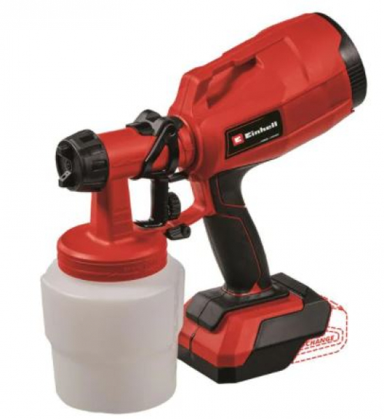Das Akku-Farbsprühsystem TC-SY 18/60 Li-Solo von Einhell eignet sich zum Sprühen von lösemittelhaltigen und wasserverdünnbaren Lackfarben, Lasuren, Grundierungen, Klarlacken, Kraftfahrzeug-Decklacken, Beizen und Holzschutzmitteln, Wasch- und Imprägniermitteln und Ölen. Das handgehaltene System ist für kleine und mittelgroße Arbeitsflächen gedacht, und durch den Softgrip lässt sich die Sprühpistole sicher und komfortabel bedienen. Bis zu 650ml pro Minute fördert der Motor, und durch die verstellbare Luftkappe kann man Vertikal-, Horizontal- oder Rundstrahl auswählen. Mit der Farbmengenregulierung lässt sich der Farbauftrag an nahezu jeden Untergrund anpassen. Der Sprühkopf ist zur leichten Reinigung aller farbführenden Elemente abnehmbar. Zum platzsparenden Aufbewahren ist am Gehäuse eine Aufhängeöse angebracht. Zwei Düsen für unterschiedliche Lack- und Lasurviskositäten, ein 100ml-Behälter zur Viskositätsprüfung, eine Reinigungsbürste zum Reinigen des Steigrohrs und Reinigungsnadel zum Säubern der Sprühdüse und ein 800ml-Farbbehälter mit Messskala und passendem Deckel werden mitgeliefert. Alle Akkus der Power X-Change-Familie mit den hochwertigen Lithium-Ionen-Zellen können mit der Sprühpistole TC-SY 18/60 Li-Solo kombiniert werden. Akku und Ladegerät der Power X-Change-Reihe sind nicht im Lieferumfang enthalten und separat erhältlich.