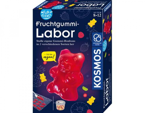 Ein Kindertraum wird wahr: Süßigkeiten selber machen und dabei sogar etwas lernen! Mit dem Fruchtgummi-Labor aus der Reihe Fun Science können Kinder ihre eigenen Gummibärchen in zwei leckeren Fruchtsorten herstellen. Einfach Fruchtgummi- und Geliermischung in wenig Wasser auflösen, aufkochen und in die Fruchtgummiformen gießen – fertig ist der vegane Naschspaß. In den vier mitgelieferten Döschen können die self-made Süßigkeiten aufbewahrt werden oder werden zu tollen Mitbringseln. Noch schnell mit den Stickern individuell gestalten und schon ist das süße Geschenk vollendet! In der Anleitung werden alle Schritte einfach und übersichtlich erklärt und es warten spannende Hintergrundinfos rund um die Leckerbissen. Naschen, forschen, lernen – die perfekte Mischung für eine tolle Zeit im heimischen „Küchenlabor“.