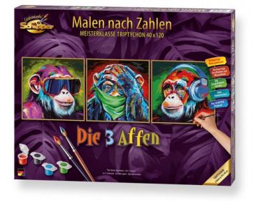Die Drei Affen-Darstellung stammt ursprünglich aus Japan. Sie soll die Menschen dazu anregen, über schlechte Dinge im Leben weise hinwegzusehen, hinwegzuhören und zu schweigen. Das Symbol der Drei Affen hat (in abgewandelter Form) auch Eingang in unsere westliche Welt gefunden. Es steht heute für eine zunehmende Ignoranz und mangelnde Zivilcourage in unserer Gesellschaft. Das Triptychon zeigt eine zeitgemäße Umsetzung dieses berühmten Drei Affen-Motivs. Farbenfroh zeigt es die Affen mit trendigen Alltagsgegenständen wie verspiegelter Skibrille, Mundschutz und Kopfhörern. Ein symbolträchtiges Beispiel moderner Kunst für das Hobbymalen.