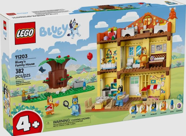 Entdecke das Zuhause von Bluey - mit diesem LEGO-Set! Zu dem modularen Spielhaus mit mehreren Zimmern gehören auch 4 Minifiguren: Bluey, Bingo, Chilli (Blueys Mum) und Bandit (Blueys Dad). Hinzu kommt aus der Fernsehserie bekanntes Zubehör wie ein Regenbogenumhang, ein Zauberstab und Lupen. Man kann alle Zimmer aus dem Modell herausnehmen - so ergeben sich neue Spielmöglichkeiten. Im Spielzimmer befinden sich ein Puppenhaus, ein Klavier und ein Kaufmannsladen. In der Küche stehen ein Kühlschrank, ein Ofen, ein Herd, ein Tisch und Stühle. Oben befinden sich das Schlafzimmer von Mum und Dad sowie das Badezimmer. Im Dachgeschosszimmer von Bluey und Bingo liegt ein Teppich. Eine Lampe und Quatschimax sind ebenfalls dort. Neben der Tür steht der Thron der Königin mit Teekanne, Tasse und Frosch. Im Garten steht ein großer Baum. Auch ein Hotdog, Pizza, ein Wasserhahn, der Kobold Jeremy und ein Luftballon, den man losfliegen lassen kann, laden zum Spielen ein.
