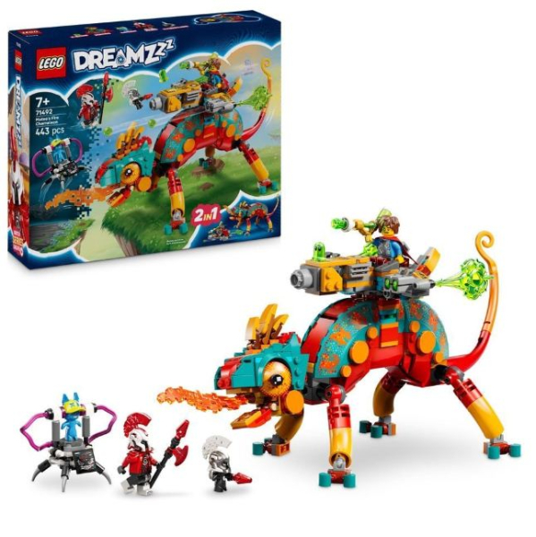 LEGO DREAMZzz Mateos Feuer-Chamäleon ist ein Bau- und Spielset für Kinder ab 7 Jahren. Jungen und Mädchen können sich mit Mateo verbünden, um Logan aus den Fängen des Bösewichts Zero zu befreien. Zuerst können sie das Chamäleon bauen und es dann entweder in ein Feuer-Chamäleon mit montiertem Blaster und 4 Shootern oder in einen schnellen Jet und einen Mini-Mech verwandeln. Das Chamäleon kann Maul, Kopf, Schwanz, Augen und Beine bewegen. In beiden Ausführungen verfügt das Modell über viele coole Details wie Booster-Module. Die Minifiguren Mateo und Zero sowie die Figuren Logan, Z-Blob und der Cyberling erwecken die Geschichte zum Leben.