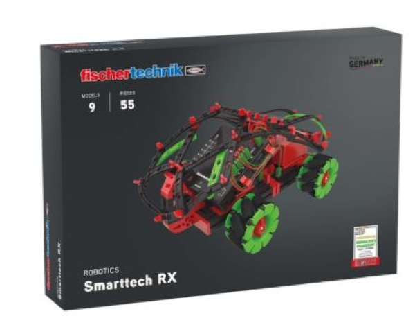 Mit dem fischertechnik Smarttech RX erwachen neun spannende Modelle zu Leben: So gehen Tüftler ab 10 Jahren auf spannende Entdeckungstour und eignen sich mit Hilfe des RX Controllers und der Software ROBO Pro erste Programmier-Kenntnisse an. Die graphische Programmiersoftware ist betriebssystemunabhängig und auch auf mobilen Endgeräten einsetzbar. Von einfachen Einstiegsmodellen über verschiedene Fahrroboter bis hin zu einem lustigen Tanzroboter ist hier für jeden etwas dabei - mit verschiedenen Lernlevels für Anfänger, Fortgeschrittene und Experten. Ein Highlight in diesem Baukasten sind die Omniwheels, die von vier Motoren angetrieben werden und so eine Bewegung in jede Richtung ermöglichen. Der Spursensor, der RGB-Gestensensor sowie der Taster ermöglichen den Bau und die Programmierung verschiedener Fahrroboter, die nur darauf warten, von den jungen Entwicklern auf Erkundungstour geschickt zu werden.