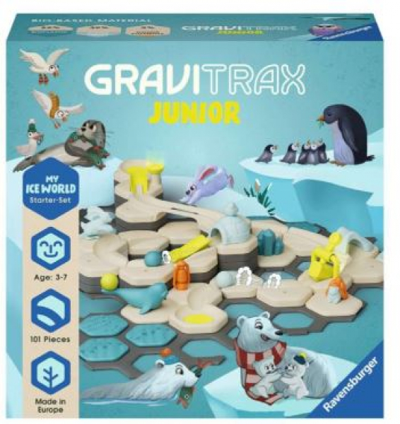 GraviTrax Junior bietet schon Kindern ab 3 Jahren einen leichten Einstieg in die Kugelbahn-Welten von GraviTrax. GraviTrax Junior ist ein interaktives Kugelbahnsystem. Jungs und Mädchen erschaffen damit ihre eigenen Kugelbahnwelten, die flexibel dekoriert werden können, wodurch ganz individuelle Themenwelten entstehen. Bau- und Spielspaß gehen dabei Hand in Hand. GraviTrax Junior kann durch Erweiterungen mit Bauteilen oder besonderen Elementen beliebig erweitert werden. Das Starter-Set L Jungle enthält alles, um individuelle Bahnen quer durch eine Eiswelt zu bauen.