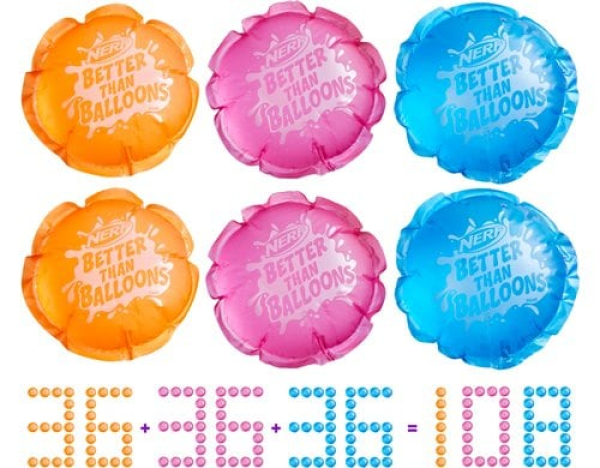 Die Marke „Nerf Better Than Balloons“ ist die Alternative zu Wasserbomben und bietet tollen Wasserspielspaß! Die farbigen Wasserkapseln sind einfach in jeder Hinsicht. Ihr innovatives Design ermöglicht ein schnelles Befüllen und einfaches Aufsammeln. Bei spannender Wasseraction sind sie leicht in der Hand zu halten und platzen beim Aufprall. Nerf Better Than Balloons Wasserkapseln bleiben in einem Stück, wenn sie platzen, sodass sie nach dem Spielen schnell aufgesammelt werden können. Hier entfällt die Suche nach den vielen kleinen Teilen, die das Aufräumen nach dem Spielen mit Wasserbomben so mühsam macht! Die Wasserkapseln kommen aneinander gereiht auf einem Bogen und lassen sich leicht abtrennen. Dank des Designs und Materials lassen sie sich leicht befüllen. Enthält insgesamt 108 Wasserkapseln auf 9 Bögen und eine wiederverwendbare Düse. Dank der einzelnen Bögen kann man sich aussuchen, wie viele man verwenden möchte. Einfach nur ein paar Bögen befüllen oder alle auf einmal verwenden!