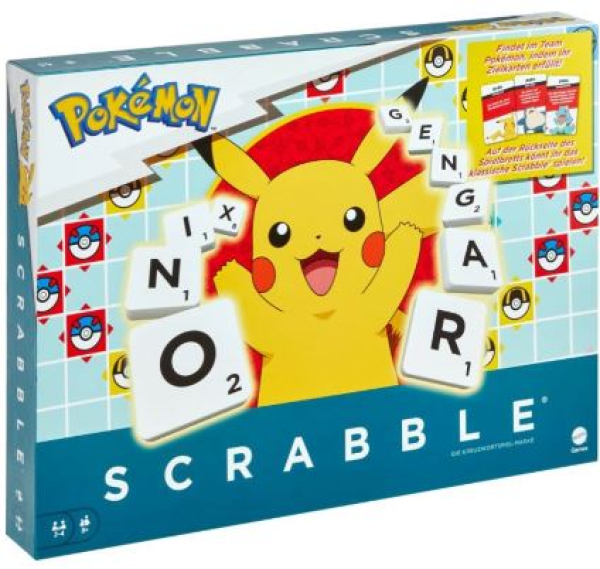 Scrabble Pokémon von Mattel bietet zwei Spiele in einem: Einmal lässt sich das beliebte und bekannte Scrabble spielen - oder aber das Spielbrett wird umgedreht, um Scrabble Pokémon zu testen! Diese Variante ist schneller und kooperativ: Hier wird als Team zusammengearbeitet um Pokémon zu fangen und dabei 50 Herausforderungskarten zu komplettieren. Dabei wird einfach eine Karte gezogen, die Herausforderungen wie zum Beispiel "Ein Wort mit fünf Buchstaben erstellen" enthält. Wer die Herausforderung meistert, behält die Karte und bekommt einen Punkt. Die Karte enthalten Herausforderungen für Anfänger und Fortgeschrittene. Mit dabei ist außerdem ein spezielles Glossar mit Pokémon-Wörtern, das beim klassischen Spiel verwendet werden kann, um einen Bonus von 10 Punkten zu bekommen.
