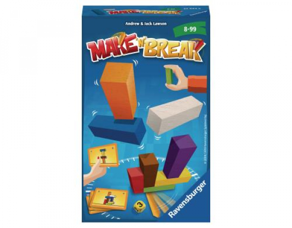 An die Steine ? fertig ? los! Stein auf Stein wird hier gebaut. Doch wer ist der größte Baumeister? Unter Zeitdruck sollen die Bauwerke auf den Karten nachgebaut werden. Wer dabei am erfolgreichsten ist, erhält am Schluss die meisten Punkte.In der kompakten Version von Make 'n' Break bauen die Spieler unter Zeitdruck Aufgaben nach. Der Baumeister, der an der Reihe ist, deckt die oberste Karte auf und bildet mit seinen Holzbausteinen die abgebildete Aufgabe nach. Hat er sie korrekt erstellt, bringt er alles sofort wieder zum Einsturz und beginnt mit der nächsten Aufgabe.Währenddessen würfelt der Zeitmeister. Er gibt an, wann die Bauzeit abgelaufen ist. Immer, wenn er eine Ziffer würfelt, addiert er sie zur vorherigen. Hat er die Summe 15 erreicht, ruft er ''Stopp! und der Baumeister muss sein Spiel sofort unterbrechen. Die Ziffern der gewonnenen Karten werden als Punkte für den Baumeister notiert.Nun wechseln reihum die Rollen von Zeitmeister und Baumeister.Gewonnen hat der Spieler, der nach der fünften Spielrunde die meisten Punkte erreicht hat. Rasanter Bauspaß im kompakten Format!
